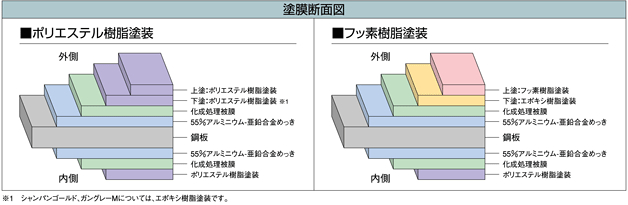 建物の屋根材や外壁材に用いられる塗装ガルバリウム鋼板の、もっとも一般的な塗装膜として広く普及しています。経済性の性能とバランスがとれています。